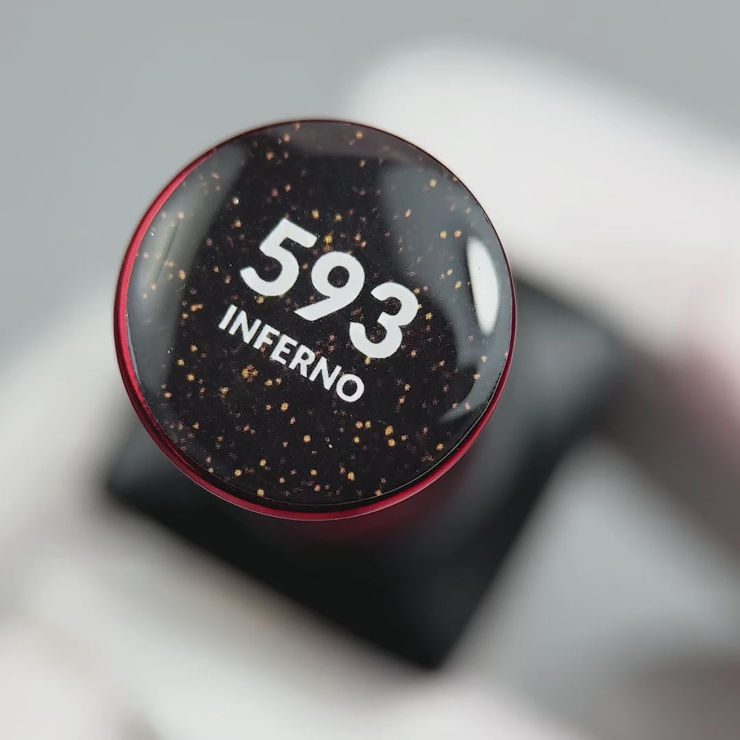 593 Inferno от Slowianka Nail Trends е дълбок, тъмен нюанс с интензивно разпръснати частици в медни и огнени тонове. Той напомня за блестящи искри на фона на нощното небе, създавайки смел, но елегантен ефект. Inferno се съчетава прекрасно със светлината, добавяйки динамика и дълбочина към маникюра. Перфектен е за вечерни визии, сезонни стилове и проекти, където силен, отличителен акцент е от значение.