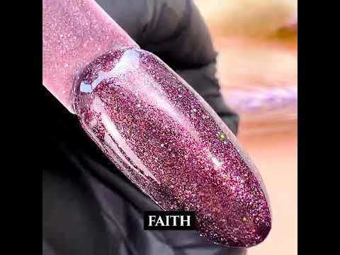 Гел лакът Faith е в силно приглушен, хладен виолетов цвят с нотка на слива. На фона му забелязваме фини частици брокат в златно, лилаво, зелено, розово и синьо. Светлината, падаща върху тези частици, създава ефекта на така наречените „бляскави цветове на хамелеони“.