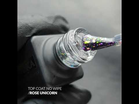 Топ лакът No Wipe Unicorn Rose е изключително устойчив на механични повреди. Характеризира се с перфектна гладкост на повърхността и висока гъвкавост. Подходящ е за всякакъв вид гел лак. Този топ съдържа микроскопични частици от розово-виолетово фолио, които придават уникален, красиво нюансиран блясък.