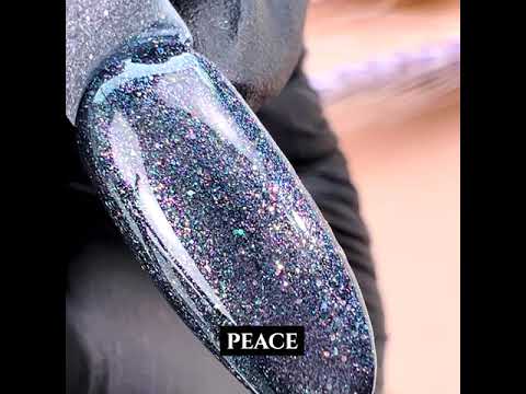 Гел лакът "Peace" е ненатрапчив цвят, който съчетава нюанси на сиво, хладно лилаво и тъмносиньо, идеален за красиви, металически стилизации. Лакът съдържа блестящи зелени, сини, сребърни и лилави частици.
